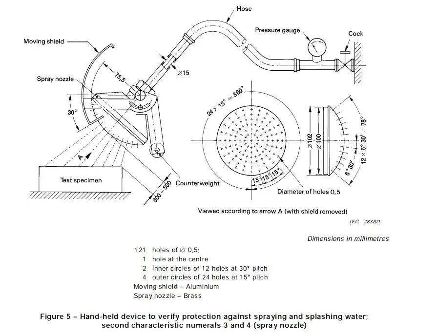 The Hand-held IPX3 IPX4 waterproof tester is to verify protection against spraying and splashing water. The water pressure can be adjusted using the valve on the tester to give the required flow rate. The pressure can be seen on the gauge which is convenient positioned by the tester. The spray pattern of the nozzle is made to the specifications of IE60529.